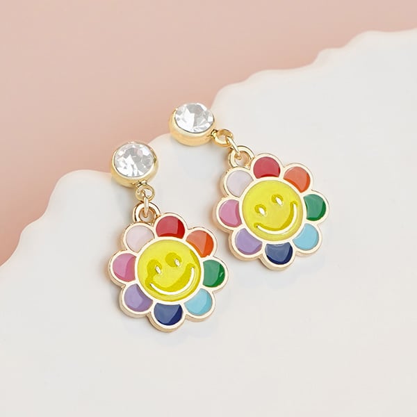 「彩虹微笑小花」兒童黏貼式耳環以七彩花瓣與可愛笑臉為主角,繽紛色彩為造型注入滿滿童趣與活力。中央笑臉展現陽光般的正能量,上方點綴晶亮鑽飾,讓整體更加閃亮吸睛,是孩子日常穿搭與節日造型的理想配件。