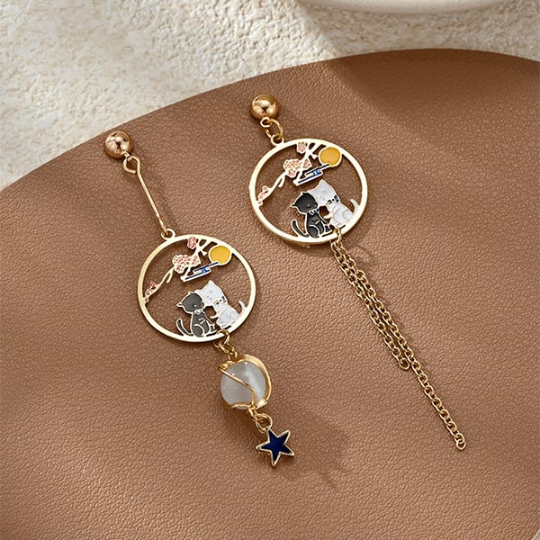 不對稱設計結合貓咪與星星元素,搭配圓形金屬框與細緻吊墜,彷彿夜晚的夢幻郵寄,為日常穿搭增添神秘與俏皮感。