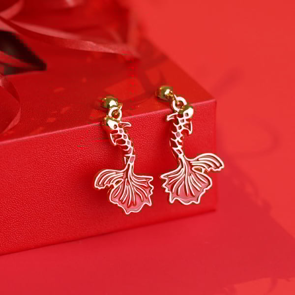 以錦鯉優雅游姿為靈感,搭配紅色漸變與金色邊框,呈現吉祥與美感,適合增添典雅氣質的造型選擇。