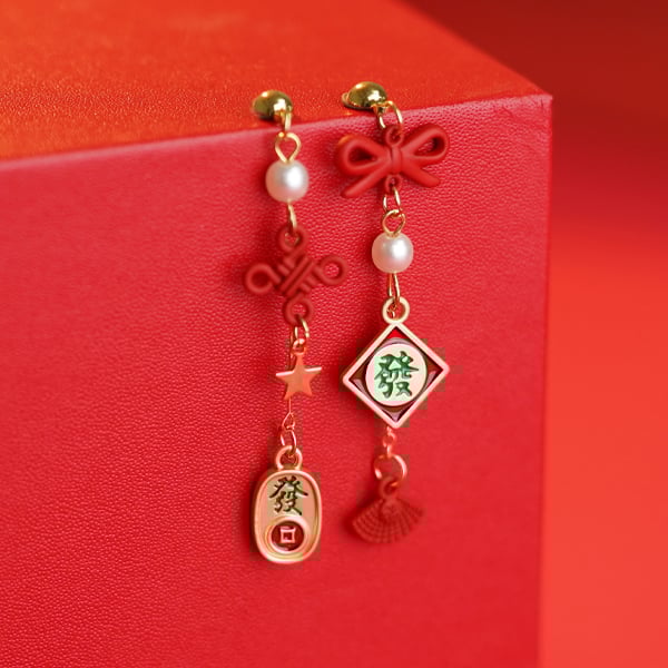 結合紅色蝴蝶結、中式結、金色吊墜與福字元素,搭配珍珠細節,象徵福氣與好運,為新年造型增添喜慶與典雅氛圍。