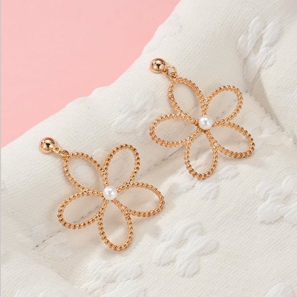 「輕奢金線花環耳環」以鏤空五瓣花為設計重點,纖細金線圍繞出立體花型,中間鑲嵌小巧珍珠,勾勒出優雅不失華麗的氛圍。整體輕盈而大方,無論是宴會、派對還是日常造型,都能為妳的耳際增添閃耀光采。