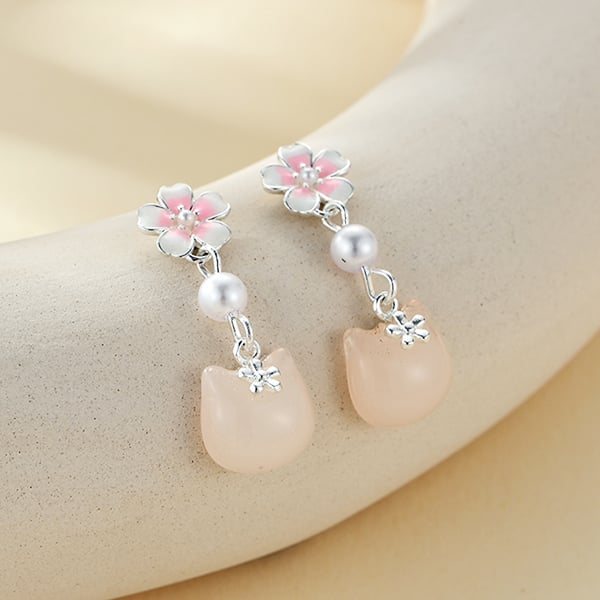 以綻放的粉嫩櫻花為耳針造型,中間串接一顆溫潤的珍珠,下方懸掛著霧面質感的貓咪輪廓墜飾。櫻花的浪漫與貓咪的俏皮完美結合,半透的霧面材質讓整體質感更加柔和,是充滿少女心的減齡單品。