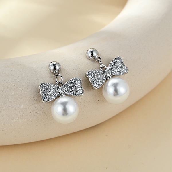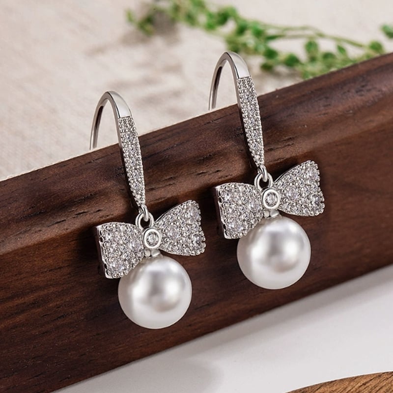 經典不敗的蝴蝶結元素,以立體飽滿的線條呈現,表面細緻的鑲嵌工藝在光線下閃耀動人。下方懸掛一顆極具份量感的圓潤大珍珠,隨著步伐優雅擺盪,完美襯托出端莊溫婉的名媛氣質,是出席婚禮或正式場合的絕佳配件。