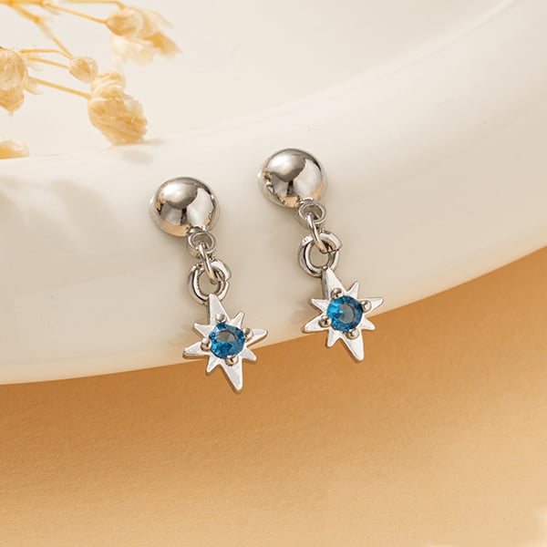 以指引方向的北極星為設計靈感,上方採用簡約的銀色圓珠耳針,下方懸掛著精緻的八芒星圖騰。中心鑲嵌一顆水藍色鋯石,如同夜空中最亮的星,隨著身體擺動隱約閃爍,為整體造型增添一份神祕而知性的光采。