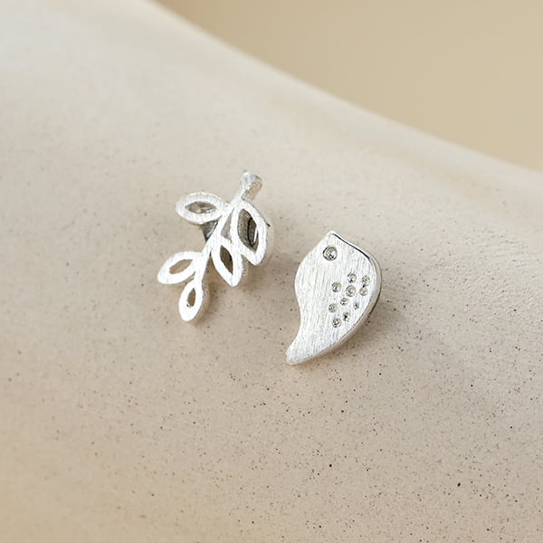 以森林為主題的不對稱設計,一耳是輪廓圓潤的可愛小鳥,另一耳則是線條細緻的鏤空樹葉。銀色金屬光澤呈現出清新自然的風格,極致迷你的尺寸,為耳畔帶來一抹輕鬆愜意的活潑氣息。