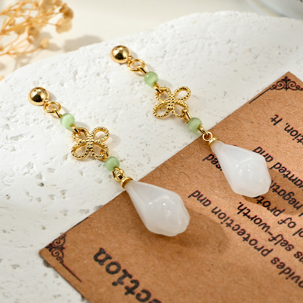 這款花影玉蹤垂墜耳環巧妙融合了經典的東方結藝元素與溫潤如玉的墜飾,修長的比例設計能在視覺上延伸頸部線條,為您的整體造型增添一份清麗脫俗的氣息。