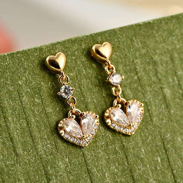這款耳環採用經典的愛心元素,上方小巧心形與下方鑲嵌閃耀水鑽的鏤空愛心交相輝映,在耳畔搖曳出迷人的金色光芒。整體設計細緻精緻,能為您的面容增添一份浪漫與優雅的氣息。