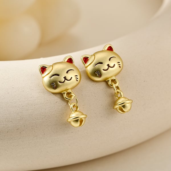 超萌招財貓造型耳環,精緻金屬質感搭配亮眼紅耳點綴,下擺垂墜靈巧小鈴鐺,為日常穿搭增添好運氣。